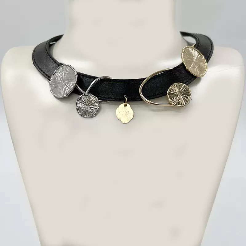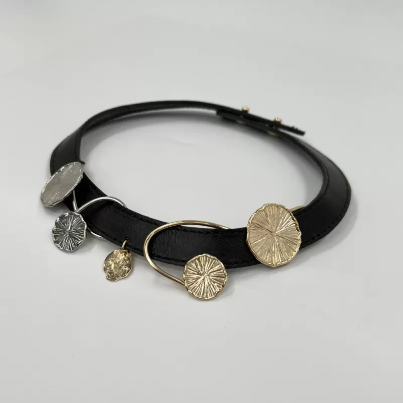 Bu tasarımda pirinç üzeri 24 ayar altın-gümüş kaplama ve yüksek kalite dana derisi kullanılmıştır.