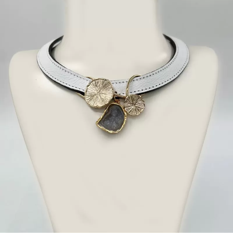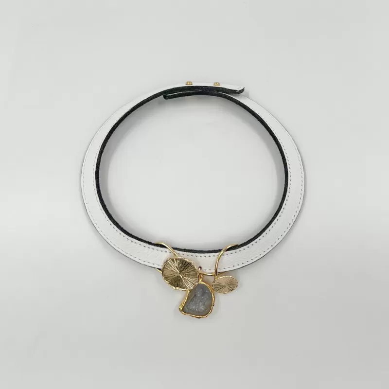 Venüs Due Gold Taşlı Beyaz Derili Tasma