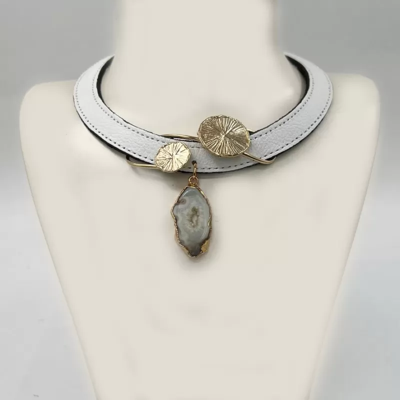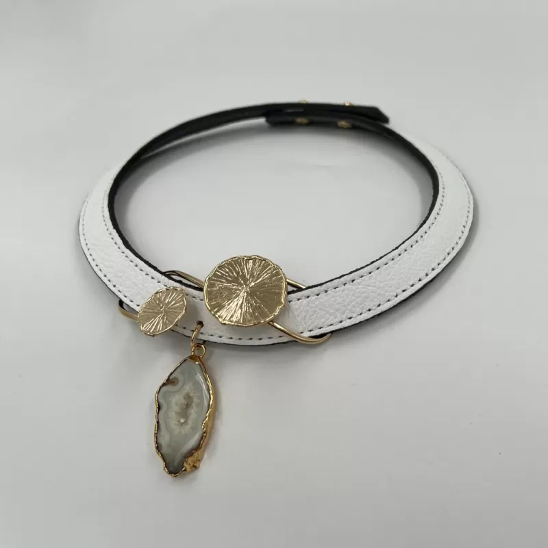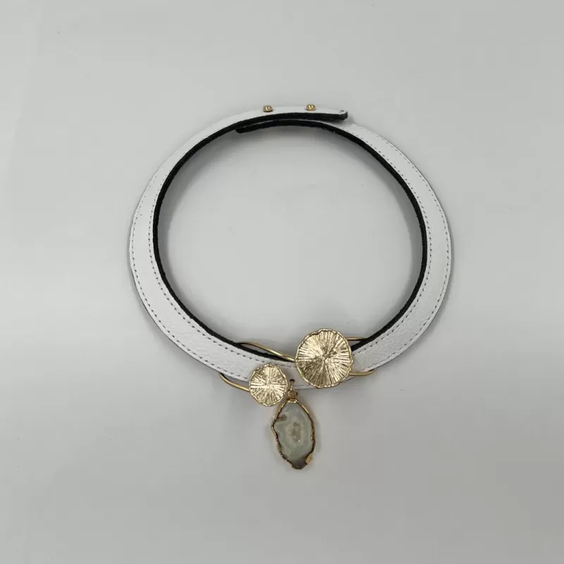 Venüs Due Gold Taşlı Beyaz Derili Tasma