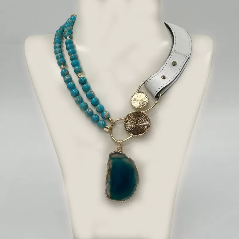 Venüs Due Gold Yarı Taşlı Beyaz Deri Kolye