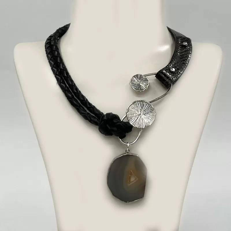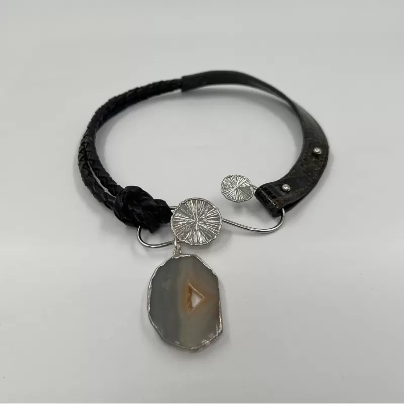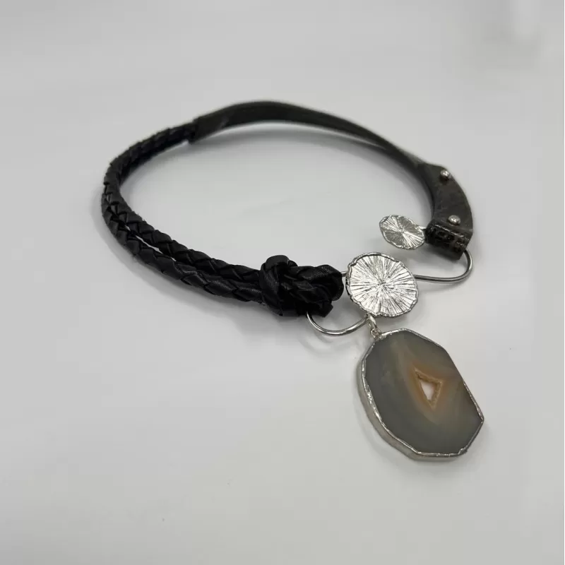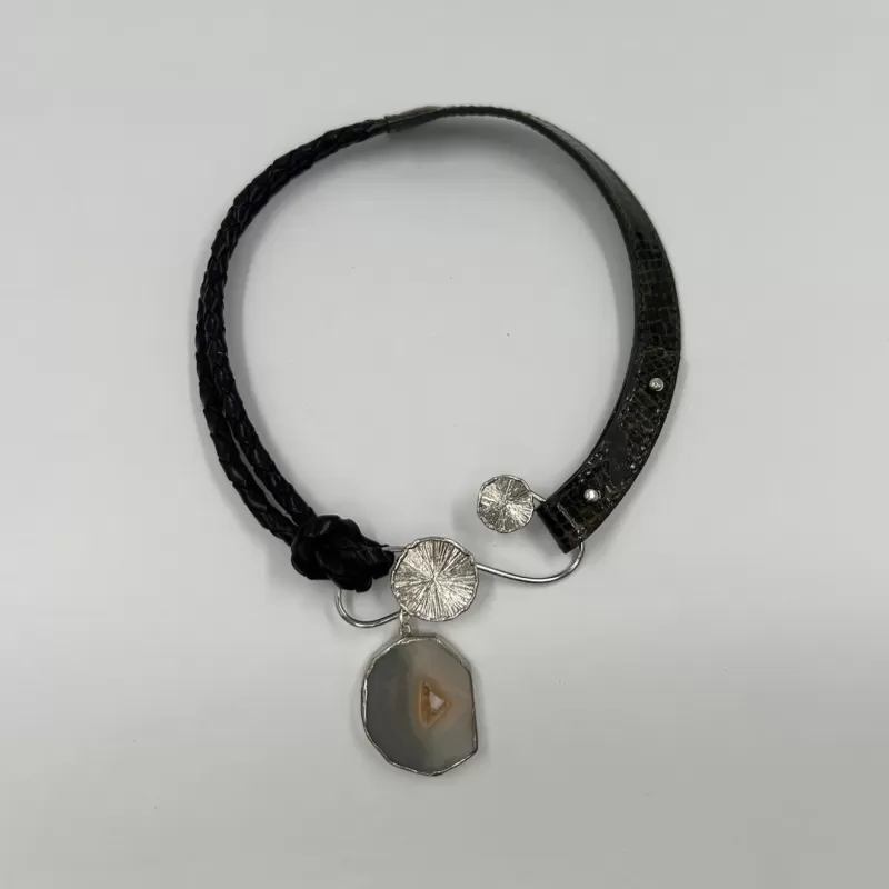 Venüs Due Gümüş Haki Örgü Derili Kolye